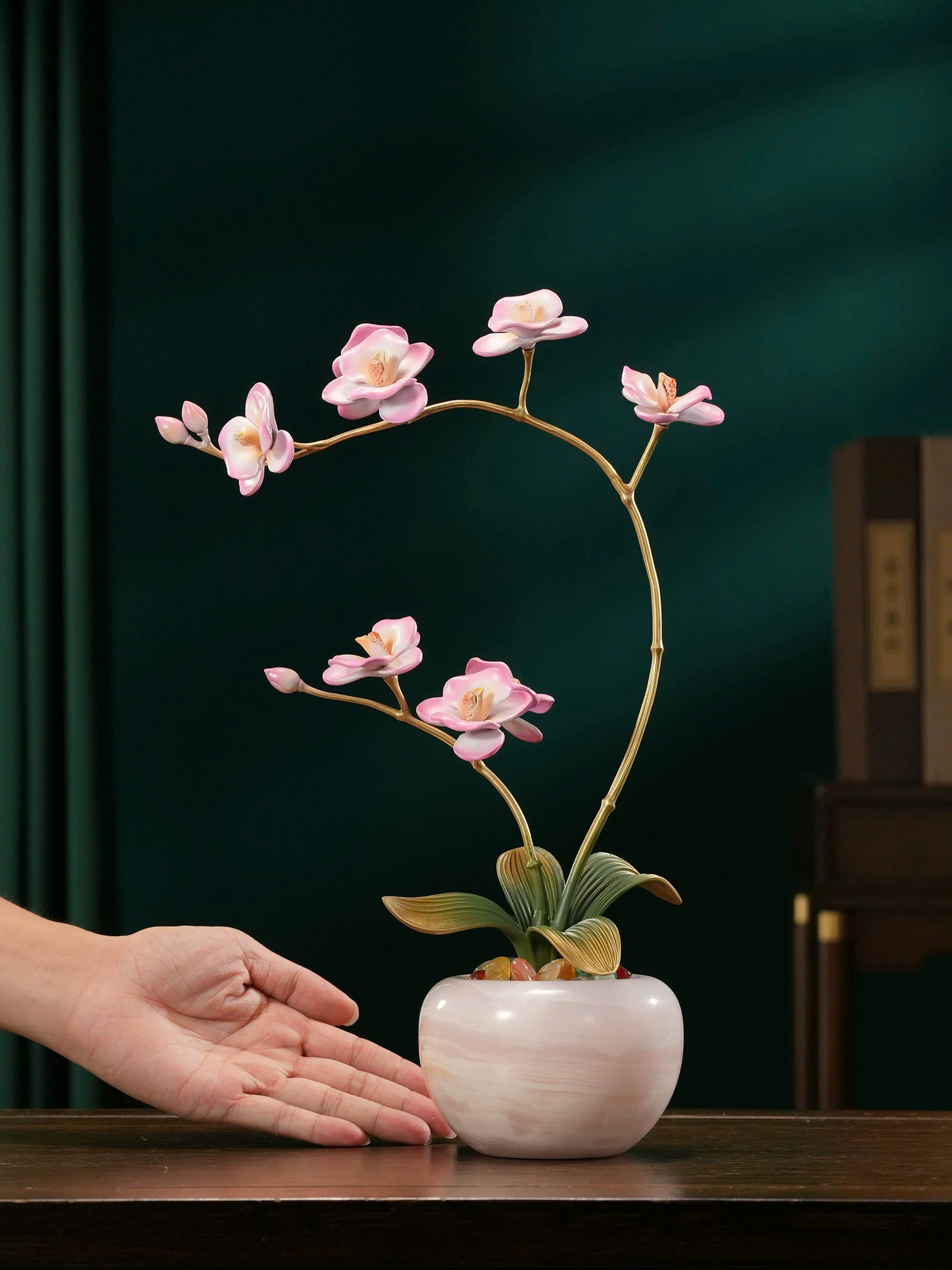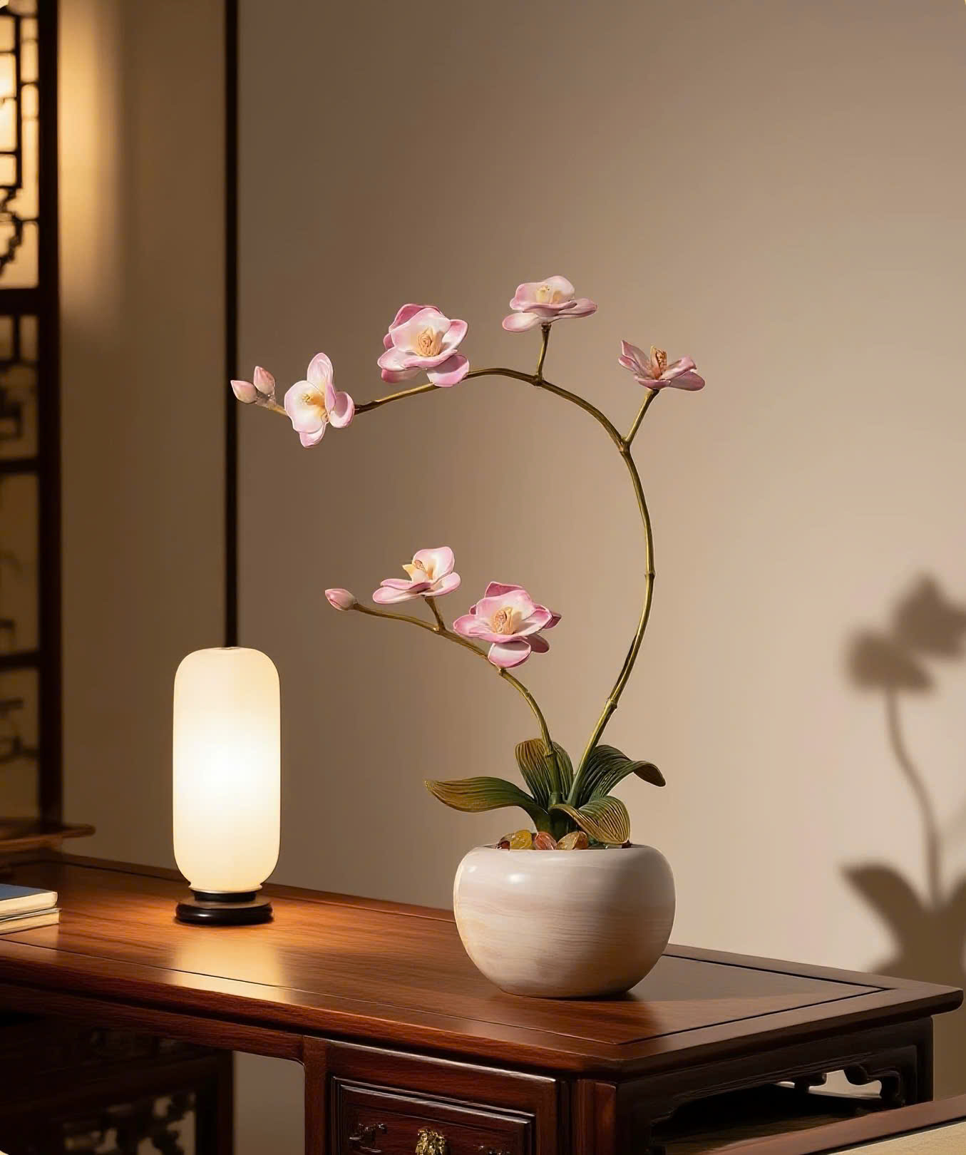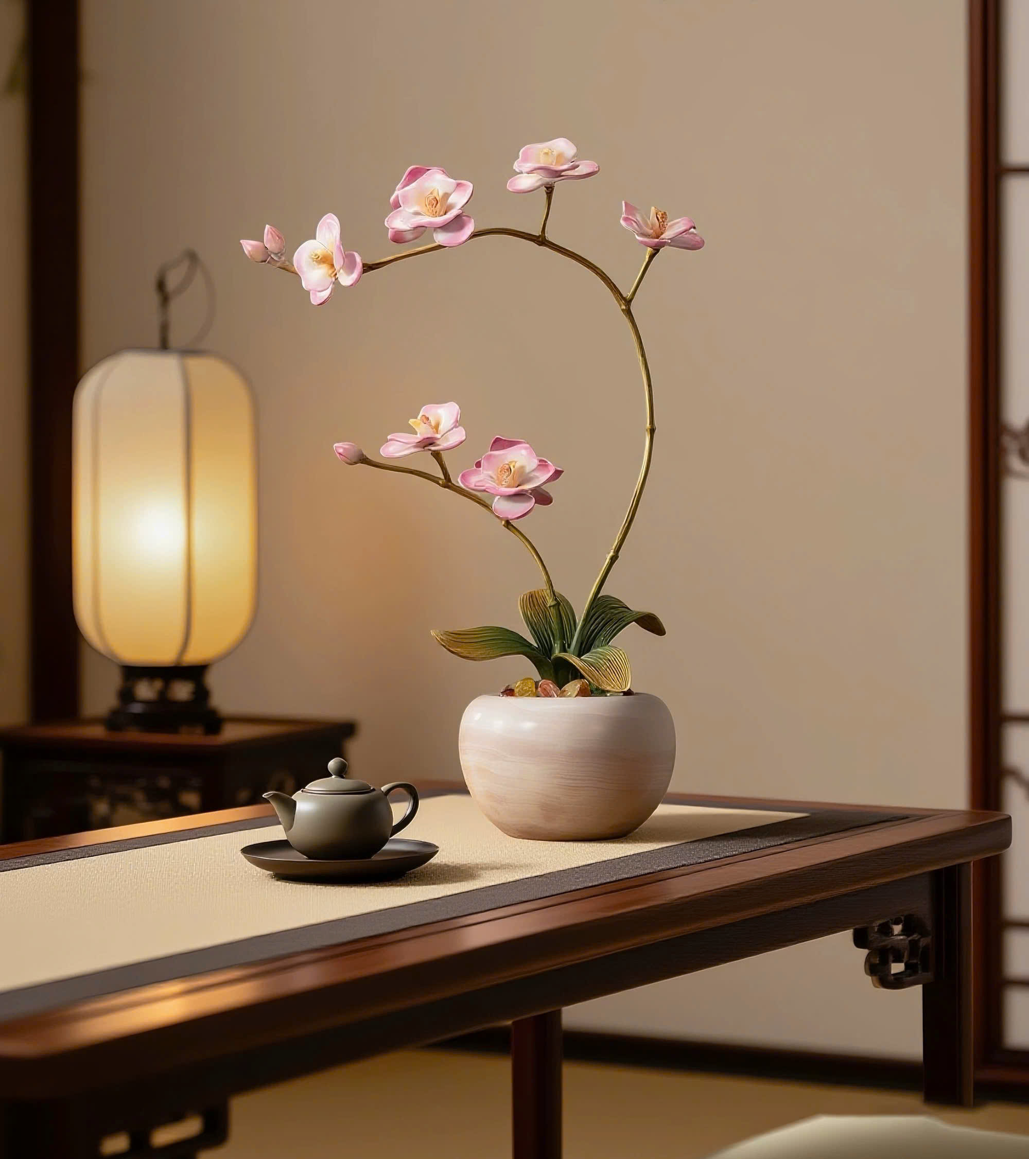 Ỷ Mộng Điệp Lan là tác phẩm trang trí mang tinh thần u lan sinh tiền – thanh khí đón gió, lấy cảm hứng từ hoa lan hồ điệp trong mỹ học phương Đông: mềm mại nhưng bền bỉ, thanh nhã mà không phô trương.